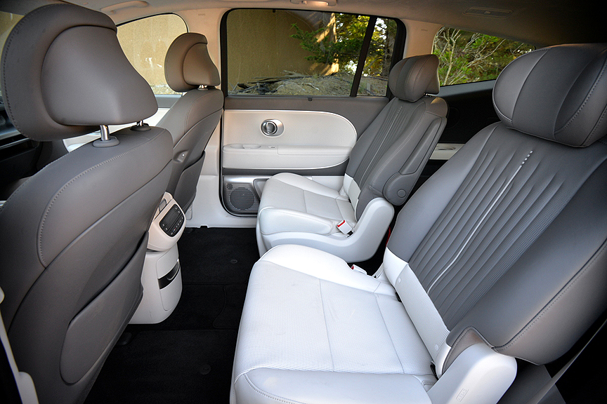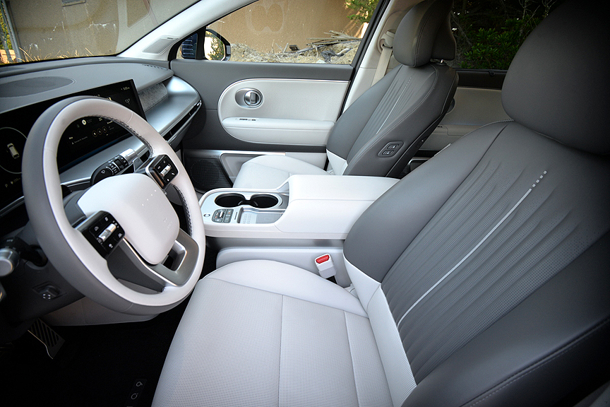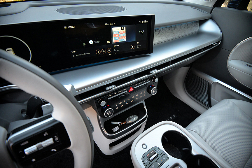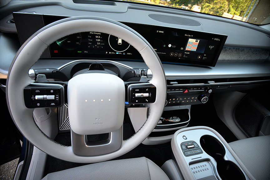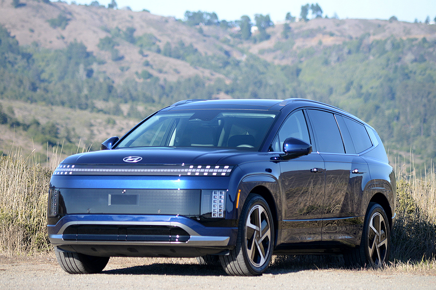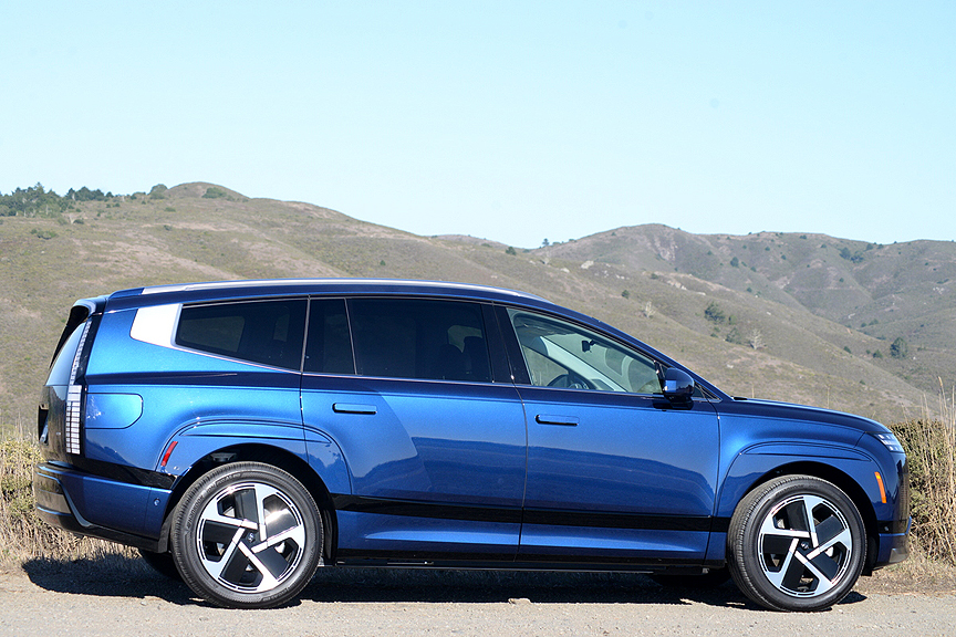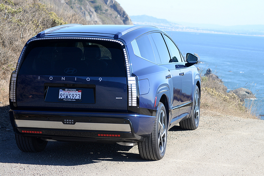 Predictably, the 9's alloy wheels are pie-plate flat discs measuring 21 x 9J, incised with a bizarre-looking 5-spoke geometric pattern sure to confirm instant status in the EV club. Mounted on these rims are enormous (and enormously expensive) 285/45R21 Hankook ION EVO SUV radials with "EV Sound Absorber" lettering emblazoned on their sidewalls. While these extra heavy-duty tires (TW 600) may mute road chatter, they communicate bumps and heaves with unfailing accuracy. We found the Performance version of the Ioniq 9, equipped with self-leveling dampers, to be jarring over pockmarked surfaces. Even the utterly luxurious "Relaxation Seats" of the Calligraphy model can't compensate for the rambunctious ride quality of the Performance I-9.